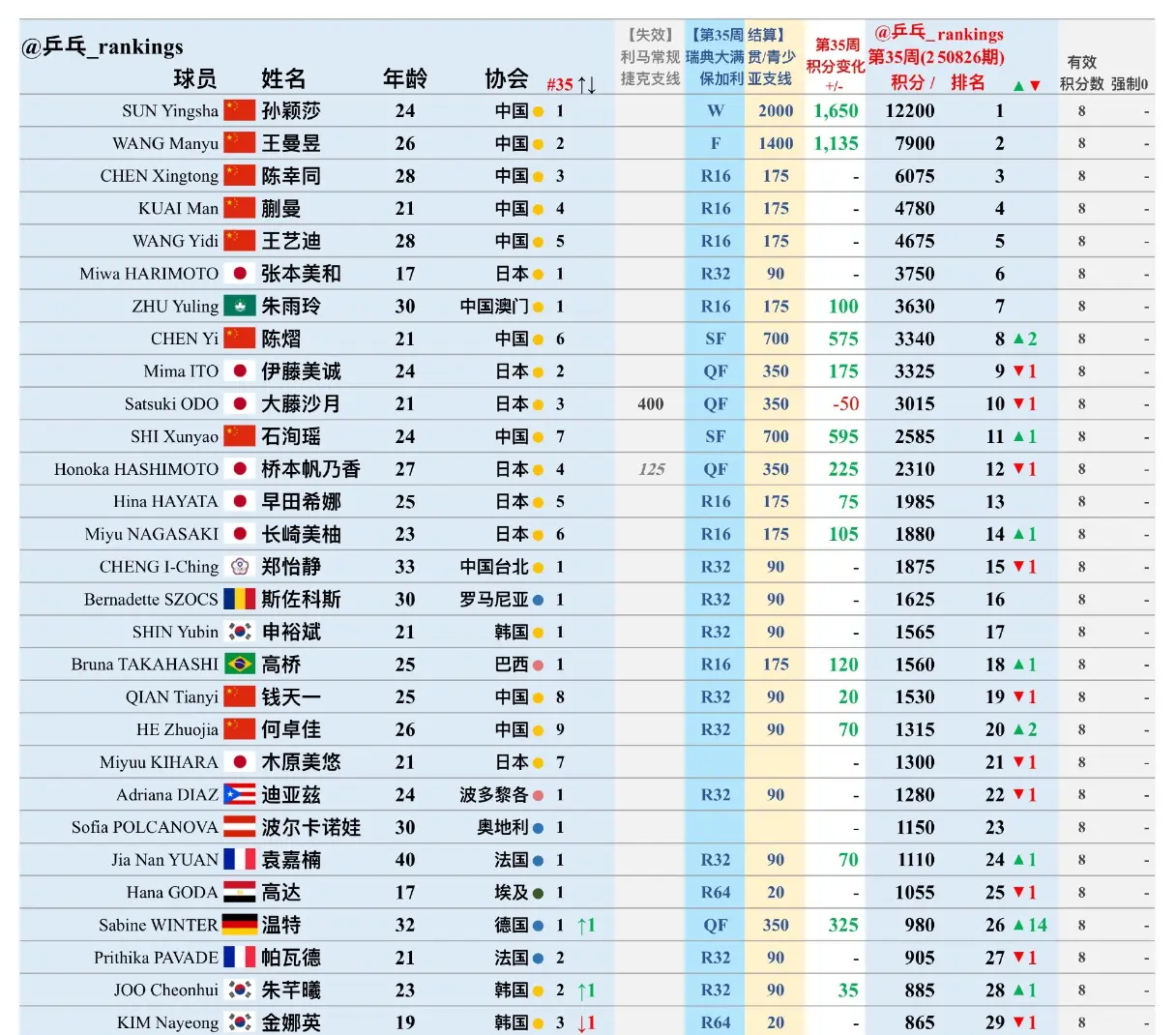 孙颖莎第35周会+1650分,总积分来到12200分再创新高,王曼昱则会+1135分升至7900分,陈熠也会升至世界第八,石洵瑶会升至世界第11,孙颖莎稳居世界第一太猛了。