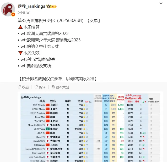 根据博主乒乓Rankings的报道,第35周世排积分变化,本周会结算瑞典大满贯、帕纳久里什泰支线,本周失效的是利马常规挑战赛、奥洛穆茨支线。